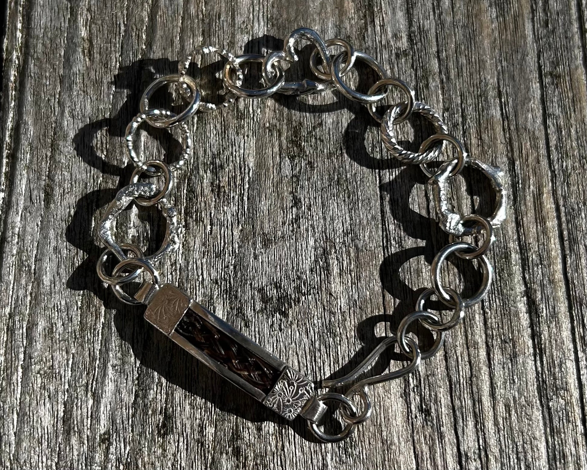 This handcrafted sterling silver charm bracelet celebrates the unique bond with your horse. Designed with beautifully crafted charm links, it captures both elegance and personal sentiment. The centrepiece pendant features a custom inlay, holding a piece of your horse’s braided tail hair for a truly unique and sentimental keepsake.