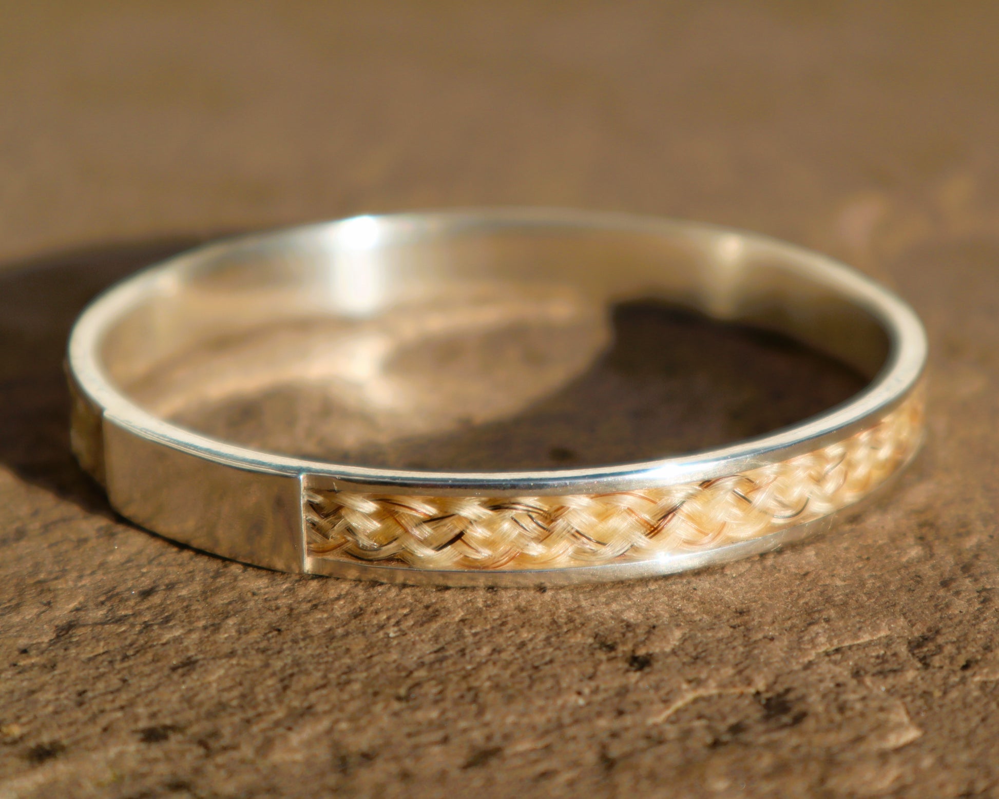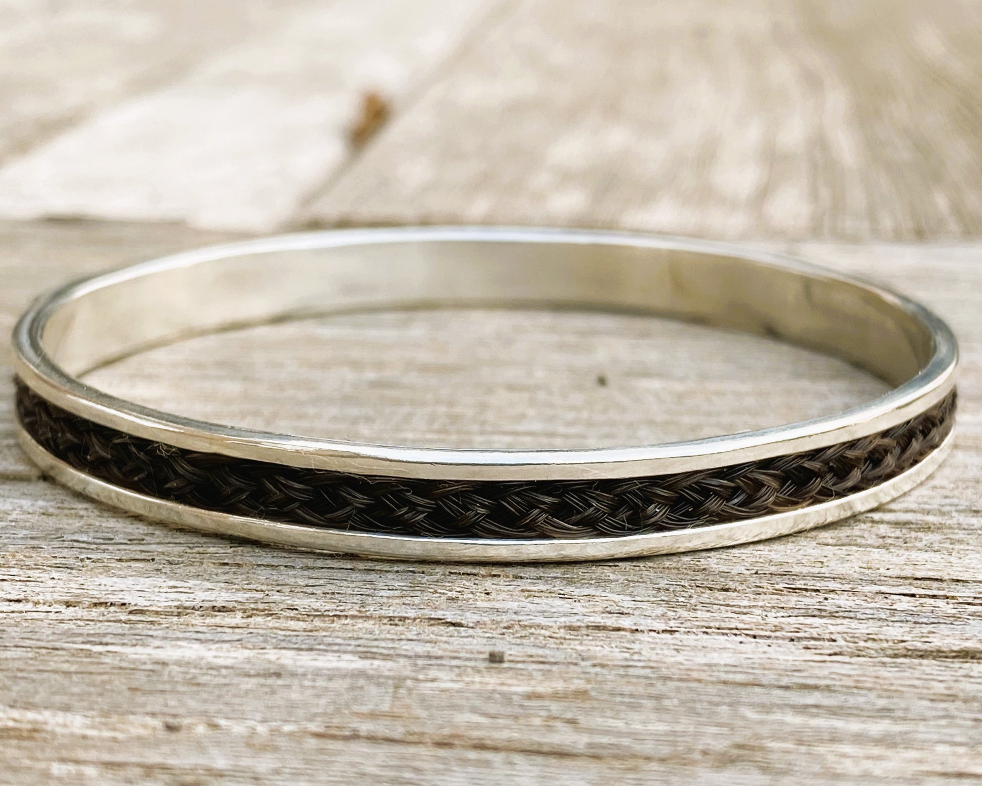 This exquisite handcrafted sterling silver bangle is inlaid with a cherished piece of your horse’s braided tail hair, creating a unique and personal piece of jewellery within a timeless design. The bangle width is approximately 8mm and hallmarked for authenticity and quality.